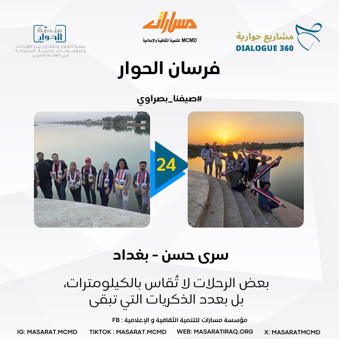 Standing at the confluence, I felt as if I was at the boundary between two different stories. The Tigris, coming from the north, carries the chill of the mountains, while the Euphrates, flowing through plains and valleys, meets it here to begin a beautiful tale: the birth of Shatt al-Arab. The river’s breeze carries a fragrant message, taking us to the true meaning of a beautiful experience and a breathtaking view, witnessing the Knights of Dialogue and their awe at Iraq’s natural beauty.